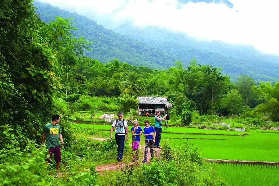- 13:00 – 15:30 Fietsen om de traditionele dorpen van de Thaise etnische minderheid en rijstvelden te bezoeken om meer te weten te komen over hun dagelijks leven, cultuur en de traditionele manier van weven. Stop bij een lokaal paalhuis voor een theepauze.
